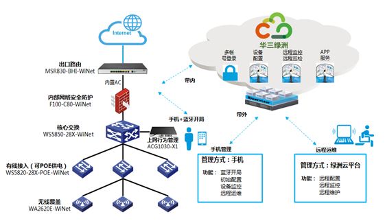部署F100-WiNet系列防火墙提供安全防护,部署MSR830-6BHI-WiNet路由器实现与总部的VPN连接,并内置AC功能模块,核心交换选择WS5850-WiNet交换机,接入选择WS5820-WiNet交换机(灵活选择POE供电交换机数量)、到无线覆盖选用WA2620-WiNet系列无线AP,同时部署上网行为管理设备ACG1030-X1提供全方面的用户行为审计。WiNet智慧网络,简化组网,智能运维,慧动互联。