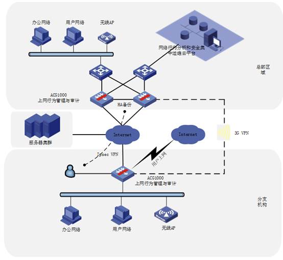 连锁型酒店行业开业频繁,且各个地区的出口带宽、房间数、访问控制需求不尽相同,ACG1000可以在门店端以一个基本配置迅速拨入VPN上线,再统一下发管理策略。